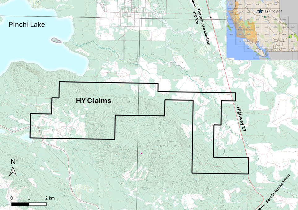 • The HY Project consists of 9 contiguous mineral claims covering 2,757.59 ha located in the Omineca Mining Division of northwest British Columbia.