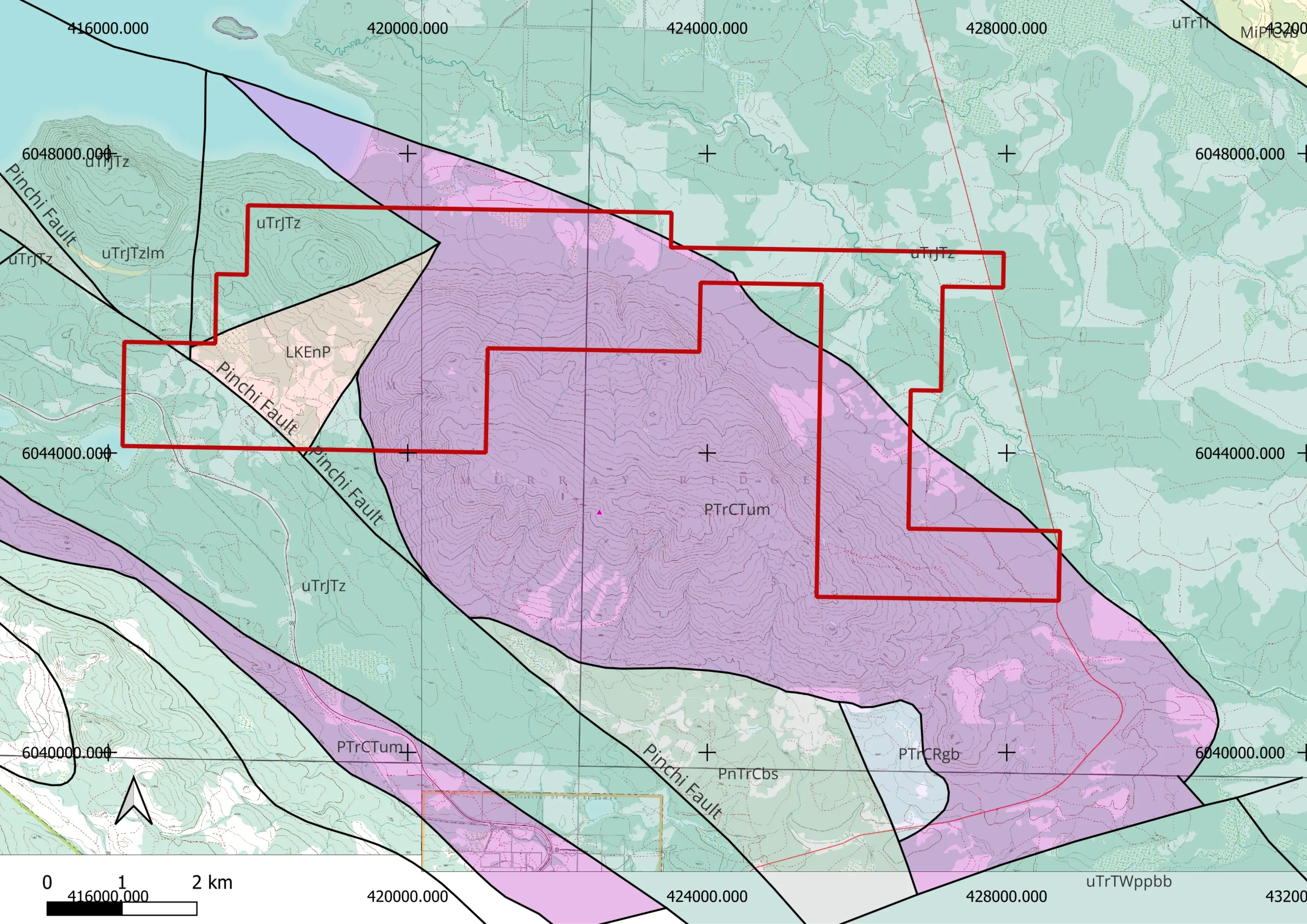 • Ultramafic–Mafic Core: The property is anchored by large, fault-bounded Trembleur ultramafic intrusions forming major ridges and hosting pyroxenite, dunite, gabbro, and serpentinized rocks – key units often linked to nickel-copper mineralization.